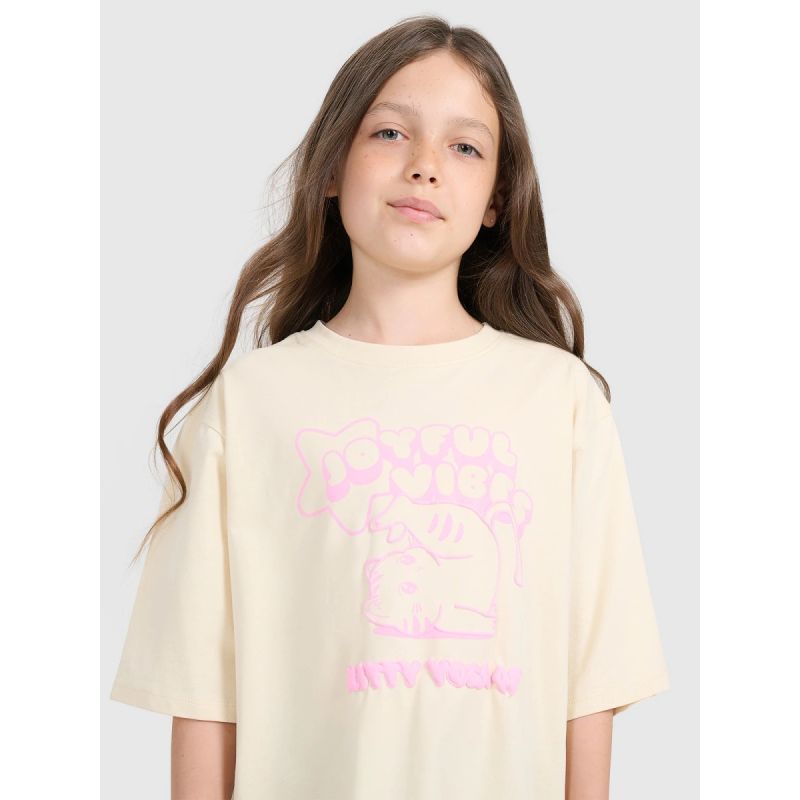 Tüdrukute 4F T-särk on mitmekülgne garderoobi põhielement, mis sobib ideaalselt igapäevaseks kandmiseks – nii vabaks kui ka sportlikuks . Selle lihtne disain ja moekas trükis esiküljel annavad sellele eristuva ja noorusliku tunde.